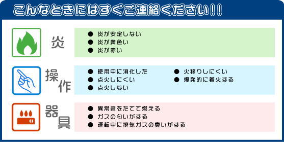 ガス漏れなどのとき、すみやかに対応します。